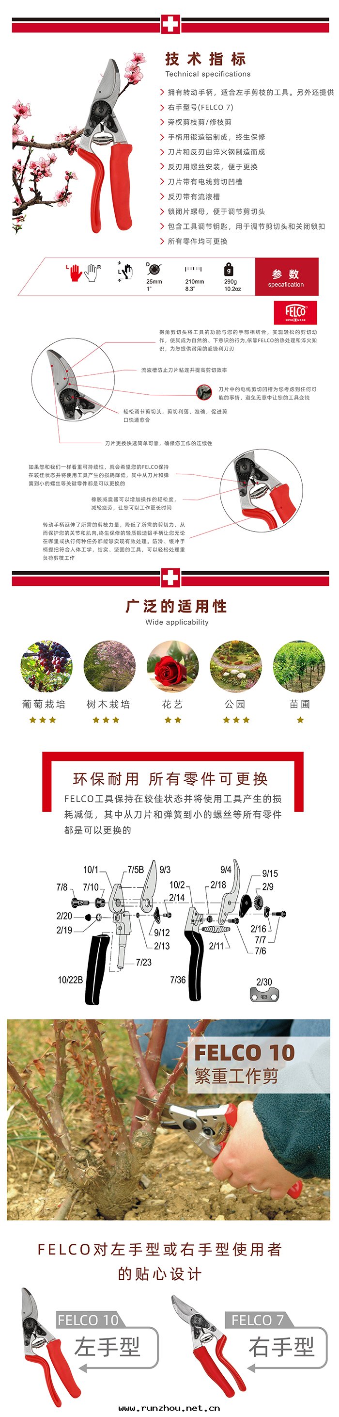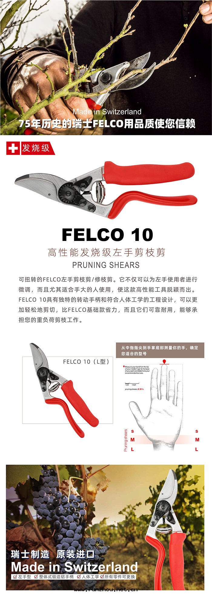借(jiè)助FELCO 10的旋轉(zhuǎn)動(dòng)作(zuò),绕軸轉(zhuǎn)動(dòng)您的剪枝工作(zuò)。这(zhè)些(xiē)左(zuǒ)手(shǒu)型剪枝剪的轉(zhuǎn)動(dòng)手(shǒu)柄可(kě)以讓您更(gèng)省(shěng)力,顯著降低(dī)連(lián)續剪枝时(shí)手(shǒu)部(bù)的疲勞感(gǎn)。一切(qiè)如(rú)此(cǐ)自(zì)然,如(rú)同(tóng)FELCO 10是(shì)每个(gè)剪切(qiè)動(dòng)作(zuò)的一部(bù)分(fēn)一樣(yàng),同(tóng)时(shí)柔和(hé)的閉合橡胶(jiāo)減震器可(kě)以防止扭傷手(shǒu)腕。通(tòng)过(guò)尖形刀(dāo)片(piàn)設計(jì)和(hé)拐角(jiǎo)剪切(qiè)头(tóu)拉近(jìn)距離,從而(ér)實(shí)現(xiàn)準确剪切(qiè),而(ér)且(qiě)通(tòng)过(guò)準确設定(dìng)機(jī)制,您可(kě)以根(gēn)據(jù)自(zì)己的喜好(hǎo)調节(jié)剪切(qiè)头(tóu)。