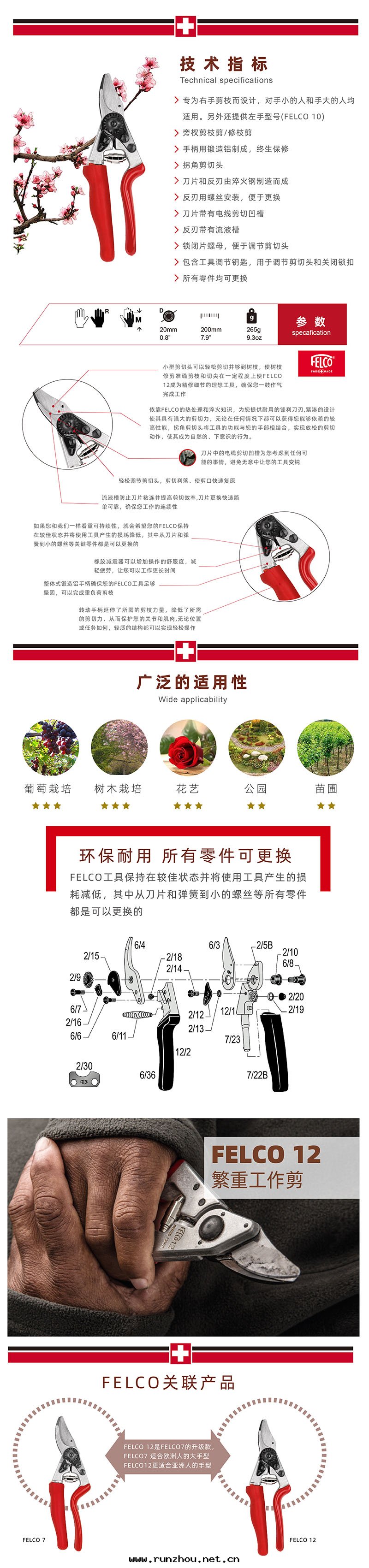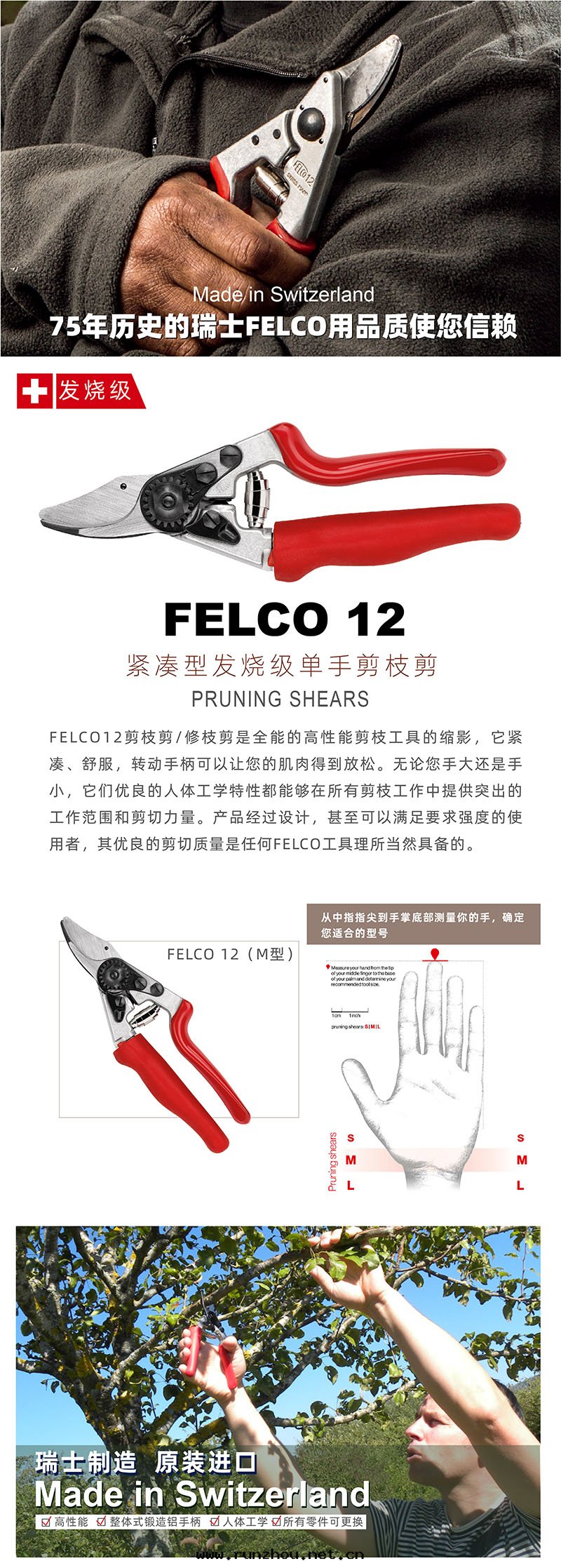 FELCO 12- 高(gāo)性(xìng)能(néng) - 人(rén)體(tǐ)工學(xué)型 - 緊湊型 FELCO 12剪枝剪/修枝剪是(shì)全(quán)能(néng)的高(gāo)性(xìng)能(néng)剪枝工具的縮影,它(tā)緊湊、手(shǒu)感(gǎn)舒服(fú),轉(zhuǎn)動(dòng)手(shǒu)柄可(kě)以讓您的肌肉得到(dào)放(fàng)松。無論您手(shǒu)大(dà)还是(shì)手(shǒu)小,它(tā)们(men)優良的人(rén)體(tǐ)工學(xué)特(tè)性(xìng)都能(néng)夠在(zài)所(suǒ)有(yǒu)剪枝工作(zuò)中(zhōng)提(tí)供傑出(chū)的工作(zuò)範圍和(hé)剪切(qiè)力量(liàng)。産品經(jīng)过(guò)設計(jì),甚至(zhì)可(kě)以滿足要(yào)求較高(gāo)的使用(yòng)者(zhě),其(qí)剪切(qiè)質(zhì)量(liàng)是(shì)任何FELCO工具理(lǐ)所(suǒ)當然具備的。 FELCO 12轉(zhuǎn)動(dòng)手(shǒu)柄的行進(jìn)路(lù)线沒(méi)有(yǒu)任何迂回(huí),可(kě)以分(fēn)散(sàn)負荷並(bìng)应对(duì)肌肉上(shàng)的应力。所(suǒ)需的剪切(qiè)力可(kě)減少(shǎo),在(zài)一整天(tiān)的剪枝工作(zuò)結束(shù)後(hòu),这(zhè)一點(diǎn)肯定(dìng)会讓您印象(xiàng)深刻(kè)。FELCO 12是(shì)适合所(suǒ)有(yǒu)手(shǒu)型的人(rén)的理(lǐ)想(xiǎng)工具,可(kě)以适应各(gè)種(zhǒng)不(bù)同(tóng)的剪枝应用(yòng)。從抓握開(kāi)始,它(tā)们(men)就(jiù)会成(chéng)为(wèi)您用(yòng)于(yú)剪枝的手(shǒu)的敏捷延伸。橡胶(jiāo)減震器和(hé)拐角(jiǎo)剪切(qiè)头(tóu)讓您可(kě)以清(qīng)晰地(dì)感(gǎn)受到(dào)操作(zuò)的舒服(fú)度(dù)。借(jiè)助完全(quán)可(kě)調的剪切(qiè)头(tóu),您很快(kuài)就(jiù)会感(gǎn)到(dào)驚讶,沒(méi)有(yǒu)它(tā)们(men)您是(shì)怎樣(yàng)剪枝的。