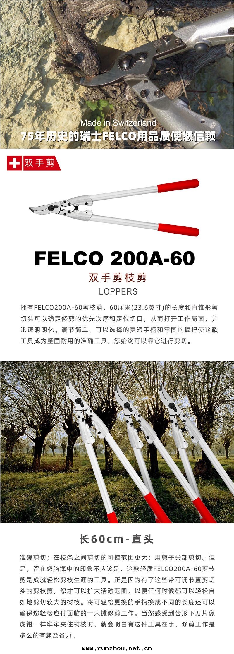 擁有(yǒu)FELCO 200A-60剪枝剪,密集生(shēng)长(cháng)沒(méi)有(yǒu)理(lǐ)由(yóu)停止。60厘(lí)米(mǐ)/23.6英寸(cùn)的长(cháng)度(dù)和(hé)直锥形剪切(qiè)头(tóu)可(kě)以确定(dìng)修剪的優先(xiān)次序和(hé)定(dìng)位(wèi)切(qiè)口,從而(ér)打(dǎ)開(kāi)工作(zuò)局(jú)面(miàn),並(bìng)迅速明(míng)朗化(huà)。調节(jié)簡單、可(kě)以選擇的更(gèng)短(duǎn)手(shǒu)柄和(hé)牢固的握把(bǎ)使这(zhè)款工具成(chéng)为(wèi)堅固耐用(yòng)的準确工具,您始終(zhōng)可(kě)以靠它(tā)進(jìn)行剪切(qiè)。 準确剪切(qiè);在(zài)枝条之(zhī)间剪切(qiè)的可(kě)控範圍更(gèng)大(dà);用(yòng)剪子尖部(bù)剪切(qiè)。但是(shì),留在(zài)您腦海(hǎi)中(zhōng)的印象(xiàng)不(bù)应该是(shì),这(zhè)款輕(qīng)質(zhì)FELCO 200A-60剪枝剪是(shì)成(chéng)就(jiù)剪枝生(shēng)涯精致(zhì)要(yào)素的優良工具。正(zhèng)是(shì)因(yīn)为(wèi)有(yǒu)了(le)这(zhè)些(xiē)带(dài)可(kě)調节(jié)直剪切(qiè)头(tóu)的剪枝剪,您才可(kě)以擴大(dà)活動(dòng)範圍,以便任何时(shí)候都可(kě)以輕(qīng)松自(zì)如(rú)地(dì)剪切(qiè)較大(dà)的树枝。将可(kě)輕(qīng)松更(gèng)換的手(shǒu)柄換成(chéng)不(bù)同(tóng)的长(cháng)度(dù)还可(kě)以确保您輕(qīng)松应付面(miàn)臨的一大(dà)攤修剪工作(zuò)。當您感(gǎn)受到(dào)齒形下(xià)刀(dāo)片(piàn)像虎鉗一樣(yàng)牢牢夾住树枝时(shí),就(jiù)会明(míng)白(bái)有(yǒu)这(zhè)件(jiàn)工具在(zài)手(shǒu),在(zài)所(suǒ)有(yǒu)修剪工作(zuò)中(zhōng)效率高(gāo)的就(jiù)是(shì)您。