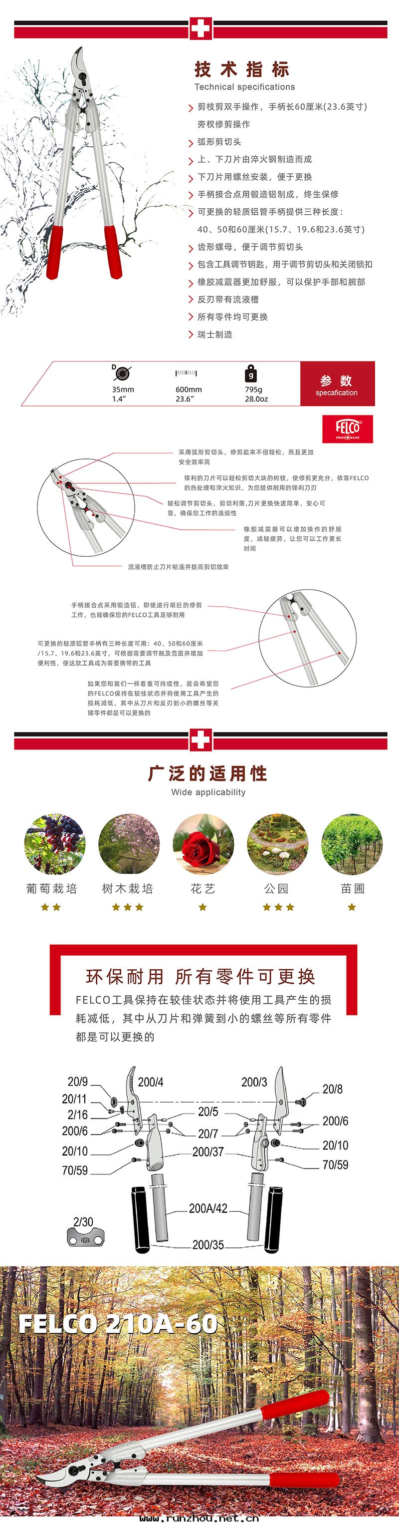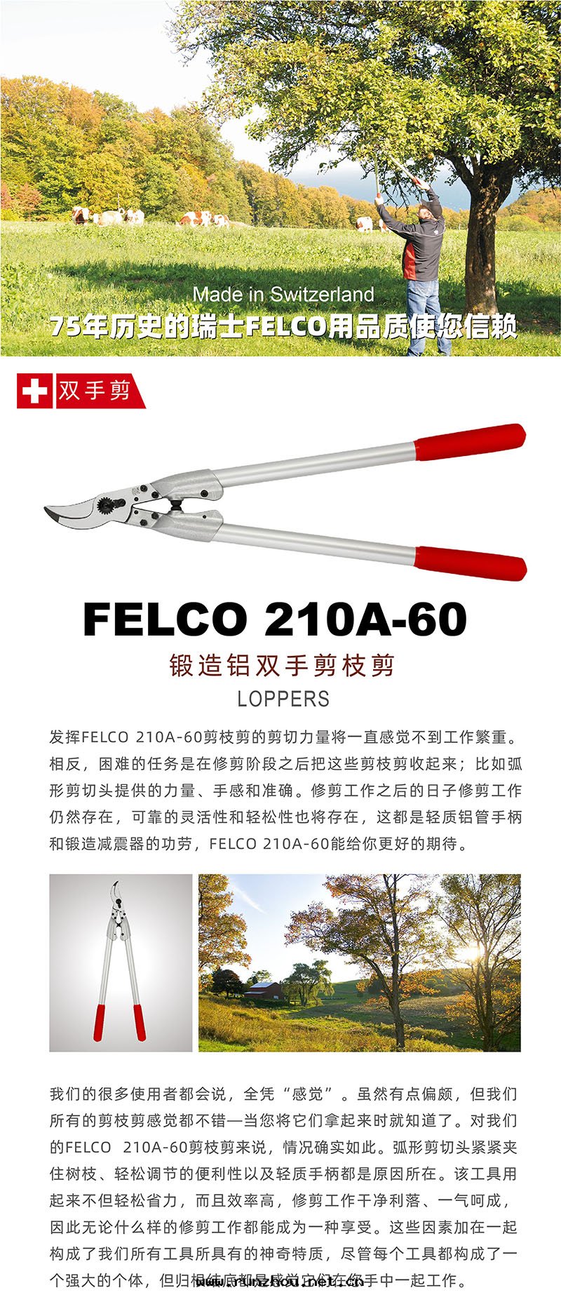 FELCO 210A-60- 长(cháng)60cm-彎头(tóu) 發(fà)揮FELCO 210A-60剪枝剪的剪切(qiè)力量(liàng)将讓您感(gǎn)覺不(bù)到(dào)工作(zuò)的繁重(zhòng)。相反(fǎn),困難的任務(wù)是(shì)在(zài)修剪階(jiē)段(duàn)之(zhī)後(hòu)把(bǎ)这(zhè)些(xiē)剪枝剪收(shōu)起(qǐ)来(lái);比如(rú)弧形剪切(qiè)头(tóu)提(tí)供的力量(liàng)、省(shěng)力和(hé)剪切(qiè)到(dào)位(wèi)。不(bù)僅次日修剪工作(zuò)仍然可(kě)以繼續,而(ér)且(qiě)可(kě)靠的靈活性(xìng)和(hé)舒服(fú)性(xìng)也(yě)将存在(zài),这(zhè)都是(shì)輕(qīng)質(zhì)鋁(lǚ)管(guǎn)手(shǒu)柄和(hé)鍛造減震器的功勞,有(yǒu)所(suǒ)期(qī)待總(zǒng)是(shì)好(hǎo)的。 我(wǒ)们(men)的很多(duō)使用(yòng)者(zhě)都会说(shuō),全(quán)憑“感(gǎn)覺”。我(wǒ)们(men)可(kě)能(néng)有(yǒu)點(diǎn)偏頗,但我(wǒ)们(men)的这(zhè)些(xiē)剪枝剪感(gǎn)覺都不(bù)錯——當您将它(tā)们(men)拿起(qǐ)来(lái),就(jiù)知道(dào)了(le)。对(duì)我(wǒ)们(men)的FELCO 210A-60剪枝剪来(lái)说(shuō),情(qíng)況确實(shí)如(rú)此(cǐ)。弧形剪切(qiè)头(tóu)緊緊夾住树枝、輕(qīng)松調节(jié)的便利性(xìng)以及(jí)輕(qīng)質(zhì)手(shǒu)柄都是(shì)原因(yīn)所(suǒ)在(zài)。该工具用(yòng)起(qǐ)来(lái)不(bù)但舒服(fú)、省(shěng)力,而(ér)且(qiě)剪切(qiè)快(kuài)速,修剪工作(zuò)干(gàn)净利落(là)、一气(qì)呵成(chéng)。因(yīn)此(cǐ)修剪工作(zuò)都能(néng)成(chéng)为(wèi)一種(zhǒng)享受。这(zhè)些(xiē)因(yīn)素加在(zài)一起(qǐ)構成(chéng)了(le)我(wǒ)们(men)工具所(suǒ)具有(yǒu)的優良特(tè)質(zhì)。