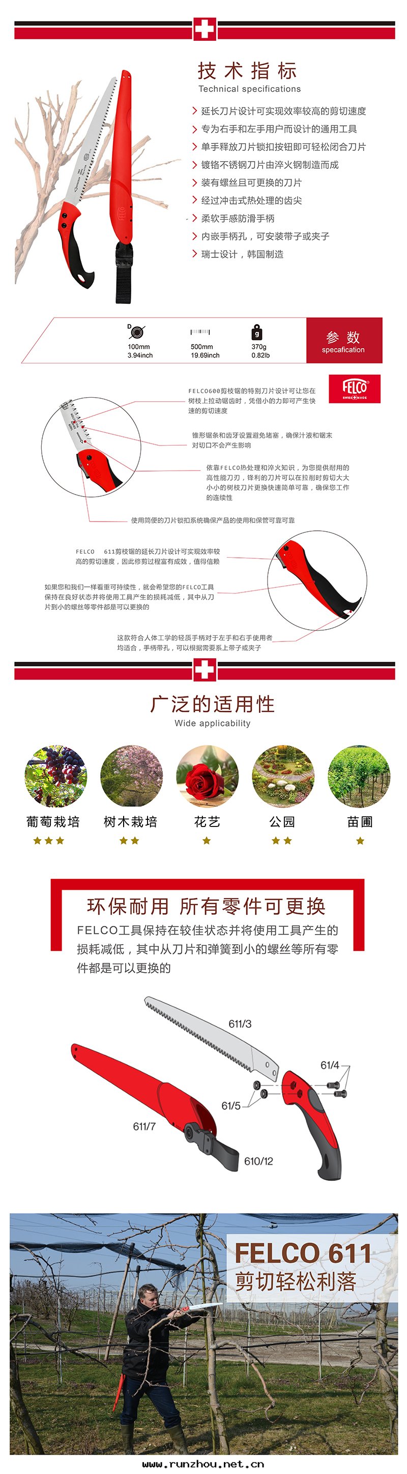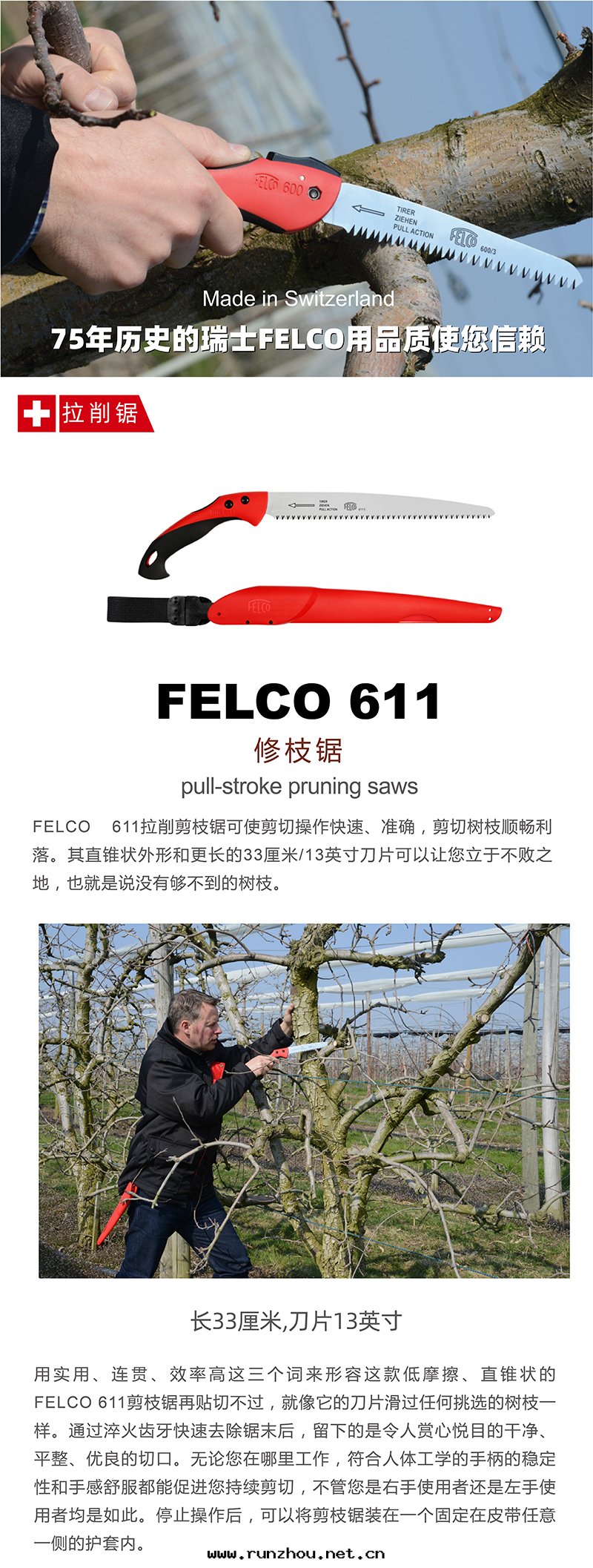 FELCO 611拉削剪枝锯可(kě)使剪切(qiè)操作(zuò)快(kuài)速利落(là),剪切(qiè)树枝暢通(tòng)無阻。其(qí)直锥狀外(wài)形和(hé)更(gèng)长(cháng)的33厘(lí)米(mǐ)/13英寸(cùn)刀(dāo)片(piàn)可(kě)以讓您立于(yú)不(bù)敗之(zhī)地(dì),也(yě)就(jiù)是(shì)说(shuō)沒(méi)有(yǒu)夠不(bù)到(dào)的树枝。 用(yòng)實(shí)用(yòng)、連(lián)貫、效率高(gāo)这(zhè)三个(gè)词(cí)来(lái)形容这(zhè)款低(dī)摩擦、直锥狀的FELCO 611剪枝锯再貼切(qiè)不(bù)过(guò),就(jiù)像它(tā)的刀(dāo)片(piàn)滑过(guò)任何挑選的树枝一樣(yàng)。通(tòng)过(guò)淬火(huǒ)齒牙(yá)快(kuài)速去除锯末(mò)後(hòu),留下(xià)的是(shì)令人(rén)赏心(xīn)悅目的干(gàn)净、平整、優良的切(qiè)口。無論您在(zài)哪里(lǐ)工作(zuò),符合人(rén)體(tǐ)工學(xué)的手(shǒu)柄的穩定(dìng)性(xìng)和(hé)手(shǒu)感(gǎn)舒服(fú)都能(néng)促進(jìn)您持(chí)續剪切(qiè),不(bù)管(guǎn)您是(shì)右(yòu)手(shǒu)使用(yòng)者(zhě)还是(shì)左(zuǒ)手(shǒu)使用(yòng)者(zhě)均是(shì)如(rú)此(cǐ)。停止操作(zuò)後(hòu),可(kě)以将剪枝锯裝(zhuāng)在(zài)一个(gè)固定(dìng)在(zài)皮(pí)带(dài)任意(yì)一側的護套(tào)內(nèi)。