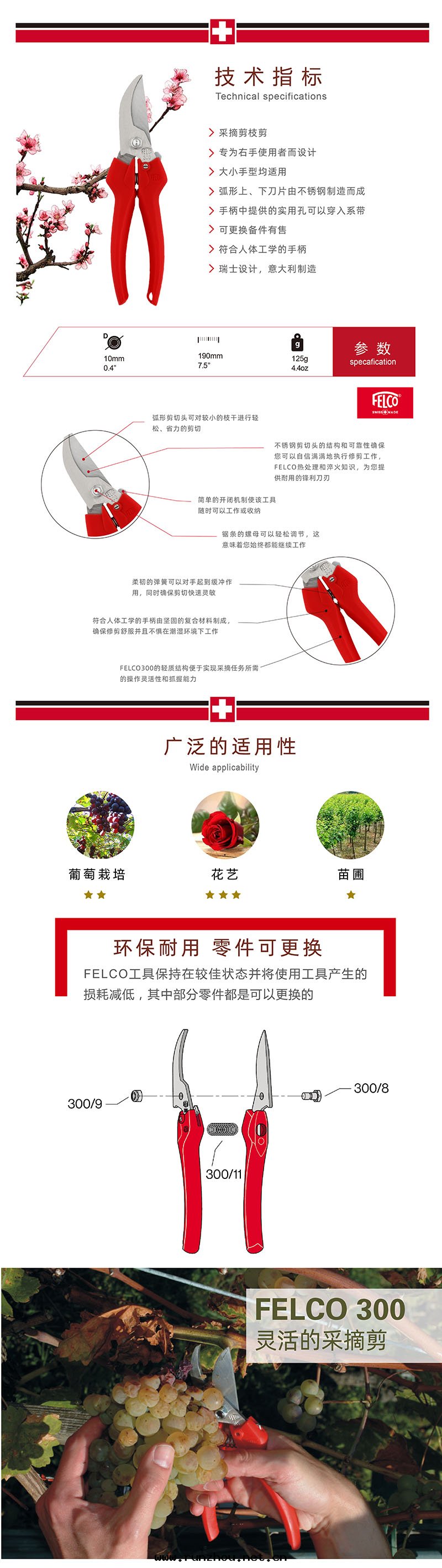 FELCO 300 - 干(gàn)净剪切(qiè) FELCO 300采摘剪将職業剪切(qiè)工具的基本(běn)特(tè)質(zhì)與(yǔ)足夠的靈活性(xìng)結合起(qǐ)来(lái),应对(duì)任何數量(liàng)的小型剪切(qiè)任務(wù)。弧形不(bù)鏽鋼(gāng)剪切(qiè)头(tóu)可(kě)拉近(jìn)您的距離,每次都謹慎地(dì)剪出(chū)準确切(qiè)口。非(fēi)常适合剪切(qiè)小树枝或采摘花(huā)朵(duǒ)和(hé)水(shuǐ)果(guǒ)。 不(bù)管(guǎn)您的手(shǒu)大(dà)小如(rú)何,都会發(fà)現(xiàn)其(qí)手(shǒu)感(gǎn)舒服(fú)的操作(zuò)靈活性(xìng)。 对(duì)于(yú)FELCO 300采摘剪的微弧形剪切(qiè)头(tóu)来(lái)说(shuō),花(huā)朵(duǒ)、水(shuǐ)果(guǒ)或小树枝統統不(bù)在(zài)話(huà)下(xià)。符合人(rén)體(tǐ)工學(xué)的手(shǒu)柄和(hé)不(bù)鏽鋼(gāng)剪切(qiè)头(tóu)只(zhī)是(shì)體(tǐ)現(xiàn)了(le)该工具的方(fāng)方(fāng)面(miàn)面(miàn)如(rú)何致(zhì)力于(yú)干(gàn)净利落(là)的其(qí)中(zhōng)两(liǎng)个(gè)特(tè)征。進(jìn)入(rù)那些(xiē)狹小空间,進(jìn)行剪切(qiè)和(hé)修剪—無一損壞—也(yě)就(jiù)是(shì)说(shuō),控制至(zhì)關(guān)重(zhòng)要(yào)。这(zhè)些(xiē)采摘剪具有(yǒu)典型的操作(zuò)靈活性(xìng)。其(qí)手(shǒu)柄加入(rù)了(le)柔韌的彈簧,可(kě)以輕(qīng)松開(kāi)閉。大(dà)小手(shǒu)型均适用(yòng),FELCO 300采摘剪幾(jǐ)乎不(bù)需要(yào)維護,使用(yòng)壽命卻很长(cháng),特(tè)别是(shì)在(zài)潮(cháo)湿(shī)环(huán)境下(xià)經(jīng)常使用(yòng)。