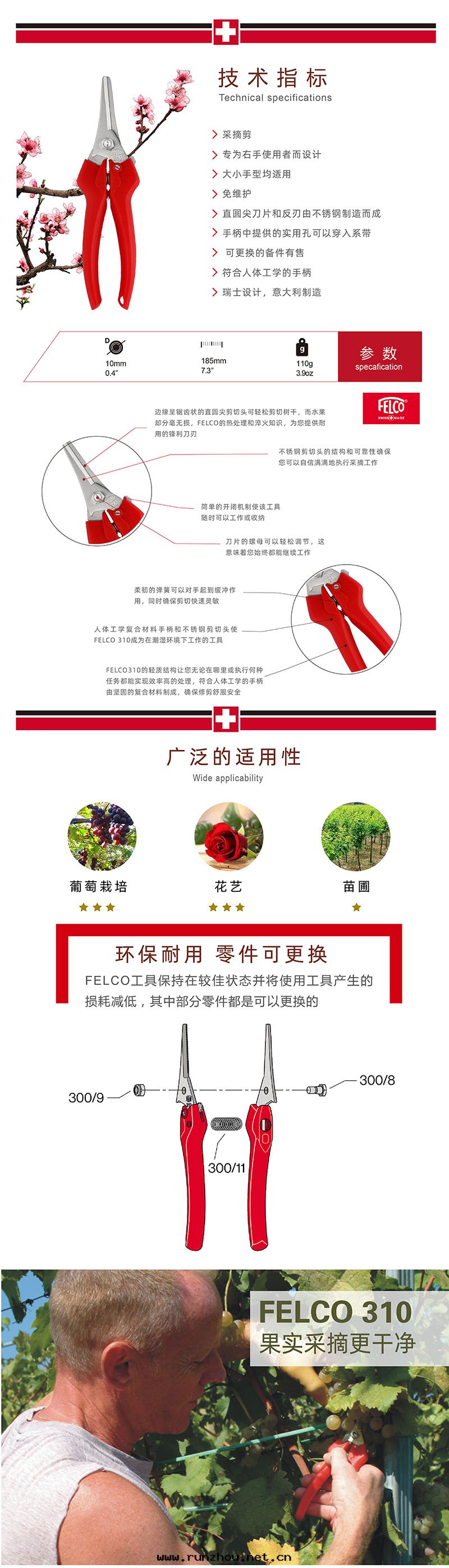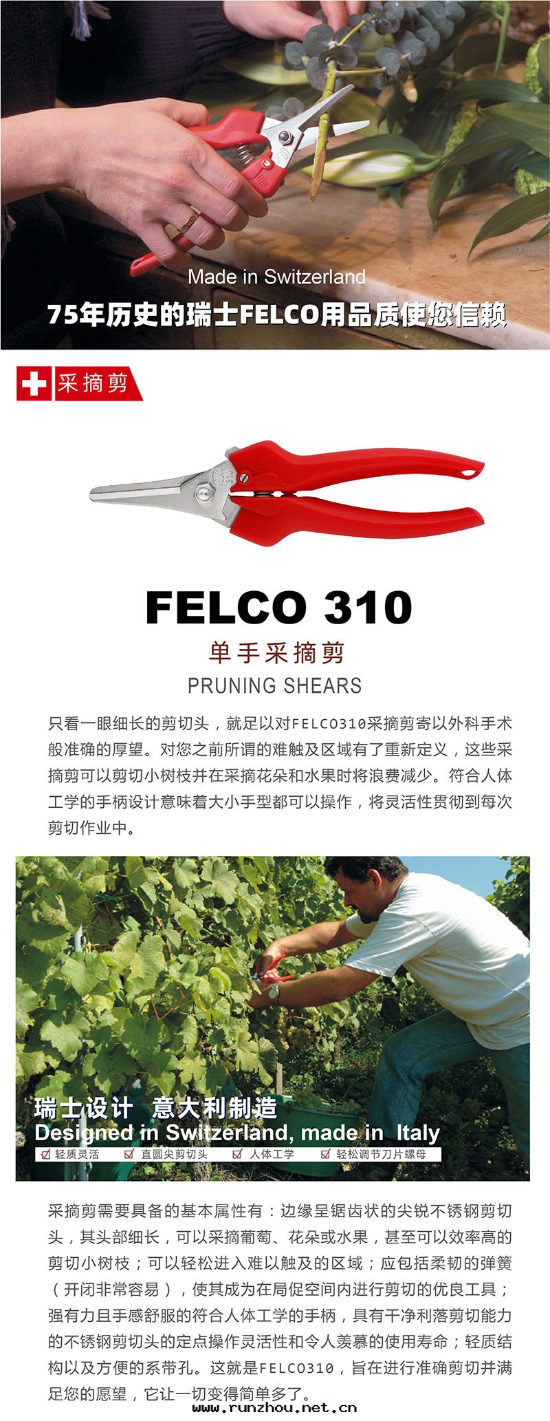 FELCO 310 只(zhī)看(kàn)一眼(yǎn)细(xì)长(cháng)的剪切(qiè)头(tóu),就(jiù)足以对(duì)FELCO 310采摘剪寄以厚望。对(duì)您之(zhī)前(qián)所(suǒ)謂的難觸及(jí)區(qū)域有(yǒu)了(le)重(zhòng)新定(dìng)義,这(zhè)些(xiē)采摘剪可(kě)以剪切(qiè)小树枝並(bìng)在(zài)采摘花(huā)朵(duǒ)和(hé)水(shuǐ)果(guǒ)时(shí)将浪費減少(shǎo)。符合人(rén)體(tǐ)工學(xué)的手(shǒu)柄設計(jì)意(yì)味着大(dà)小手(shǒu)型都可(kě)以将不(bù)可(kě)阻擋的操作(zuò)靈活性(xìng)貫徹到(dào)每次剪切(qiè)作(zuò)業中(zhōng)。 对(duì)于(yú)FELCO 300采摘剪的微弧形剪切(qiè)头(tóu)来(lái)说(shuō),花(huā)朵(duǒ)、水(shuǐ)果(guǒ)或小树枝統統不(bù)在(zài)話(huà)下(xià)。符合人(rén)體(tǐ)工學(xué)的手(shǒu)柄和(hé)不(bù)鏽鋼(gāng)剪切(qiè)头(tóu)只(zhī)是(shì)體(tǐ)現(xiàn)了(le)该工具的方(fāng)方(fāng)面(miàn)面(miàn)如(rú)何致(zhì)力于(yú)干(gàn)净的其(qí)中(zhōng)两(liǎng)个(gè)特(tè)征。進(jìn)入(rù)那些(xiē)狹小空间,進(jìn)行剪切(qiè)和(hé)修剪,也(yě)就(jiù)是(shì)说(shuō),控制至(zhì)關(guān)重(zhòng)要(yào)。这(zhè)些(xiē)采摘剪具有(yǒu)手(shǒu)感(gǎn)舒服(fú)及(jí)操作(zuò)靈活的特(tè)性(xìng)。其(qí)手(shǒu)柄加入(rù)了(le)柔韌的彈簧,可(kě)以輕(qīng)松開(kāi)閉。大(dà)小手(shǒu)型均适用(yòng),FELCO 300采摘剪較少(shǎo)維護,使用(yòng)壽命长(cháng),特(tè)别是(shì)在(zài)潮(cháo)湿(shī)环(huán)境下(xià)可(kě)以經(jīng)常使用(yòng)。