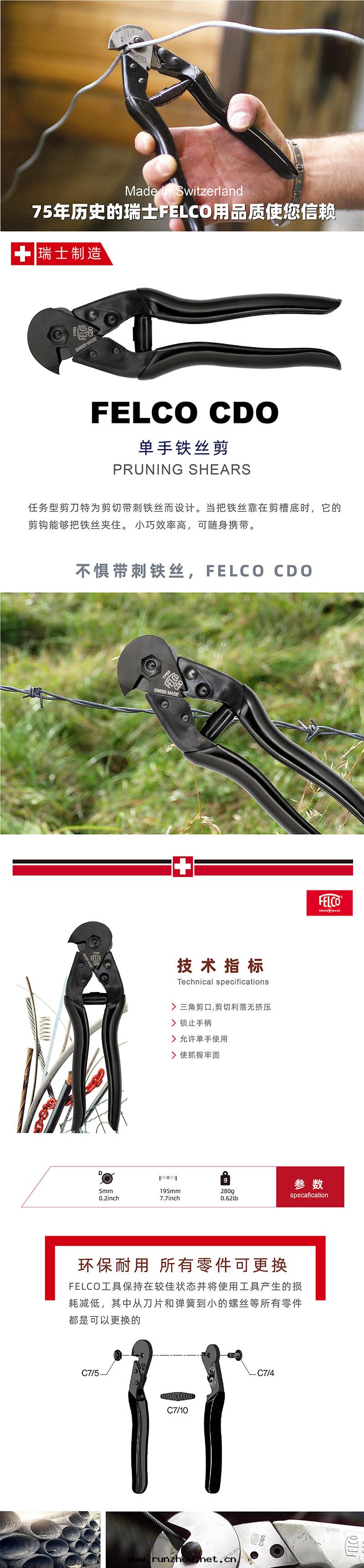 FELCO CDO 剪切(qiè)带(dài)刺铁(tiě)丝 任務(wù)型剪刀(dāo)專为(wèi)剪切(qiè)带(dài)刺铁(tiě)丝而(ér)設計(jì)。 當把(bǎ)铁(tiě)丝靠在(zài)剪槽底时(shí),它(tā)的剪鈎能(néng)夠把(bǎ)铁(tiě)丝夾住。 小巧可(kě)随身(shēn)攜带(dài)。