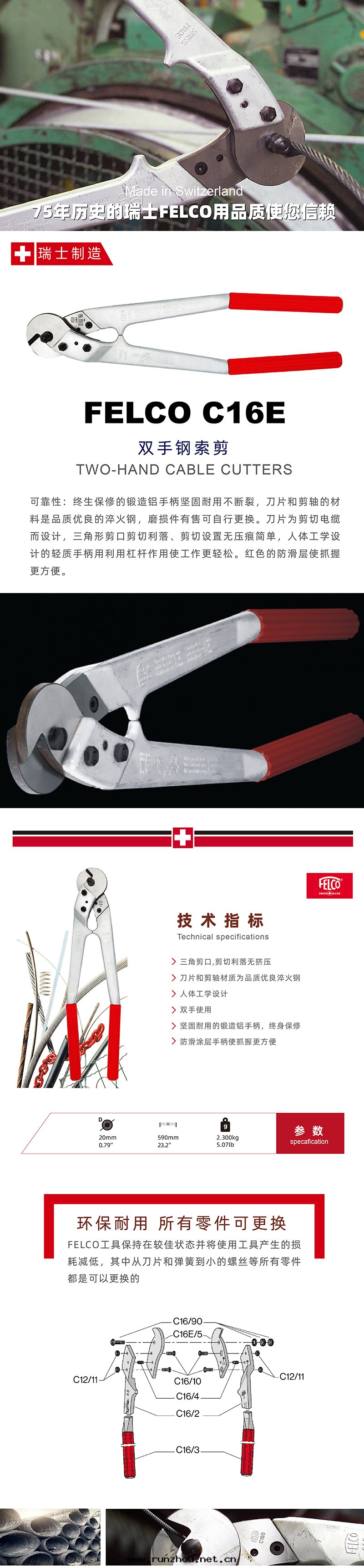 FELCO C16E- 電(diàn)缆(lǎn)剪 可(kě)靠性(xìng):鍛造鋁(lǚ)手(shǒu)柄堅固耐用(yòng)不(bù)斷裂,終(zhōng)生(shēng)保修/ 刀(dāo)片(piàn)和(hé)剪軸的材料是(shì)高(gāo)等級淬火(huǒ)鋼(gāng) / 磨損件(jiàn)可(kě)更(gèng)換。 效能(néng):刀(dāo)片(piàn)專为(wèi)剪切(qiè)電(diàn)缆(lǎn)而(ér)設計(jì) / 三角(jiǎo)形剪口保證剪切(qiè)利落(là)、無压痕 /簡單而(ér)持(chí)久的剪切(qiè)設置 人(rén)體(tǐ)工學(xué):輕(qīng)質(zhì)手(shǒu)柄 / 杠杆作(zuò)用(yòng) / 防滑层(céng)保證抓握方(fāng)便